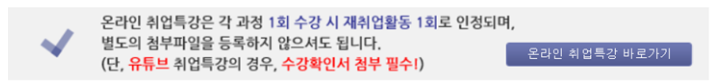 기존에 서류전형이나 면접역량과 같은 프로그램에 수강을 완료하게 되면 각 1회씩에 한하여 실업인정이 가능했었는데요. 이제는 각각의 프로그램에 대해서는 최대 2회까지 최초수강 및 재수강에서 실업인정이 가능하게 변경이 되었습니다.