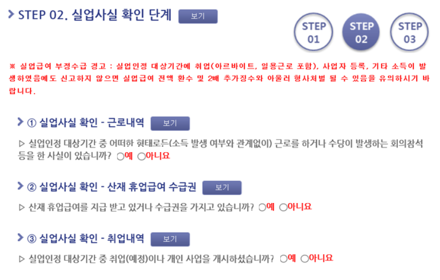 그다음 두 번 째 단계에서는 실업사실 확인을 하는 단계인데, 특별히 해당되는 것이 없으면 전부다 '아니오'를 선택해주시면 됩니다.