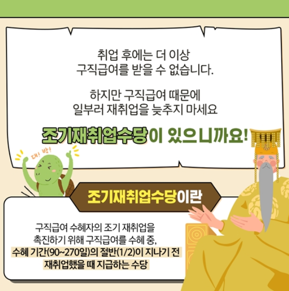 이렇게 조기재취업 수당을 주는 이유는 실업급여를 받는 것으로 만족을 해서 다시 취업활동을 열심히 하지 않는 것을 방지하기 위함이겠지요;