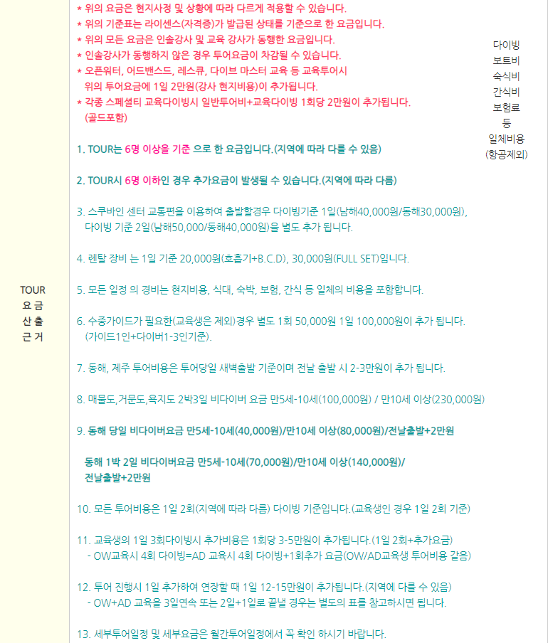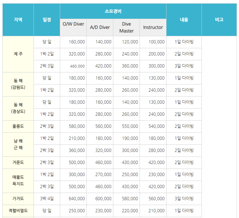 아래 내용은 '스쿠바인'업체의 가격내용을 바탕으로 작성하였습니다.