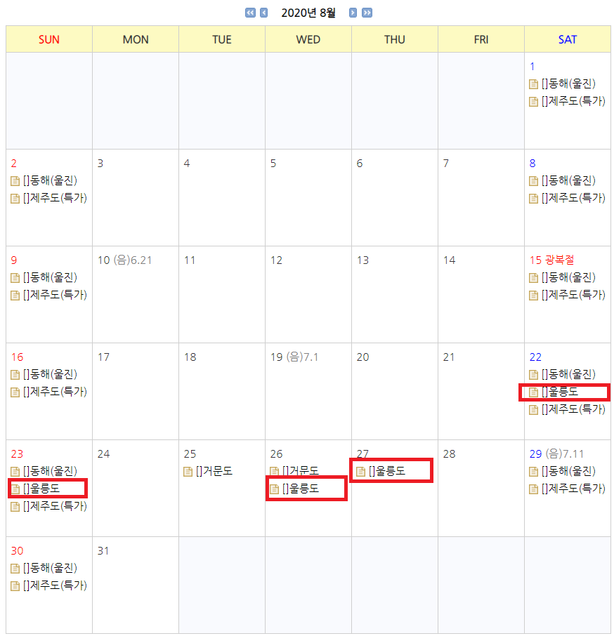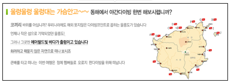 우선 http://www.scubain.co.kr/스쿠바인 홈페이지 바로가기 (링크)로 접속하시면 우선 월간투어일정을 확인하실 수가 있는데 성수기인 7월 8월의 울릉도 일정은 7월에 1번 8월에 2번이 있는 것으로 확인이 됩니다.