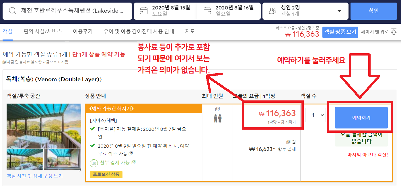 아래 이미지처럼 원하는 날짜에 방을 찾으셨다면, 예약하기를 눌러줍니다.