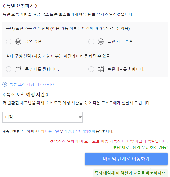 그리고 특별 요청하기에서 입맛에 맛는 방을 선택해준뒤 마지막단계로 이동하기를 눌러줍니다.