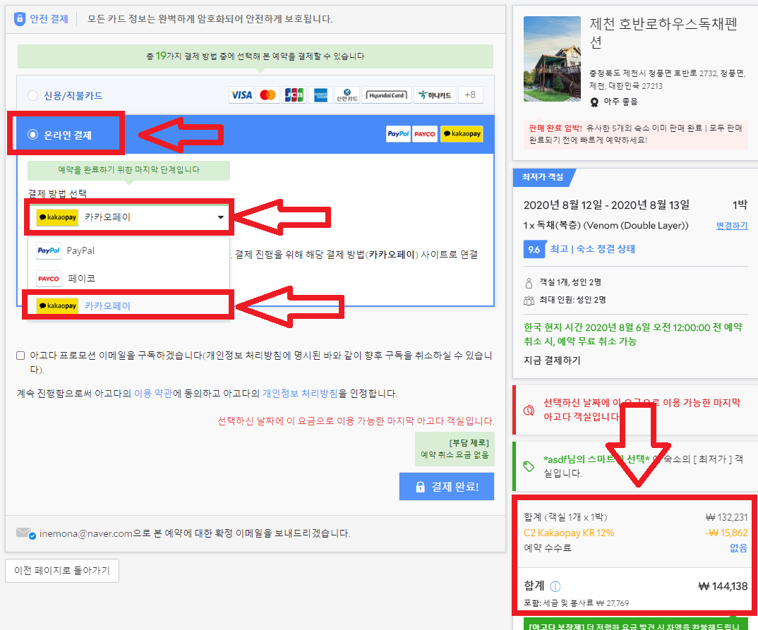 마지막 단계에서 온라인 결제 옵션에서 카카오페이 옵션으로 선택을 해주시면 오른쪽 아래에서 할인된 금액을 확인하실 수가 있습니다.