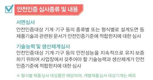 안전인증 심사종류로는 서면심사와 기술능력 및 생산체계심사 그리고 제품심사와 확인심사로 나뉘어집니다.