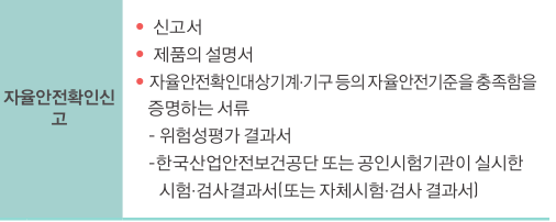 자율안전확인신고는 신고서와 제품의 설명서 그리고 각종 안전기준을 충족하는 서류와 위험성평가 등을 첨부하시면 됩니다.