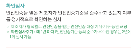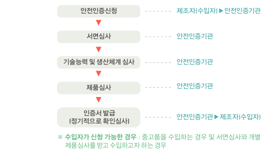 그 후 안전인증 기관에서는 서면심사/기술능력 및 생산체계 심사/제품심사를 거친 후에 제조자(혹은 수입자)에게 인증서 발급으로서 통지를 하게 되며, 정기적으로는 확인심사를 거치어야합니다.