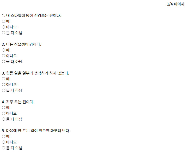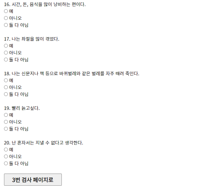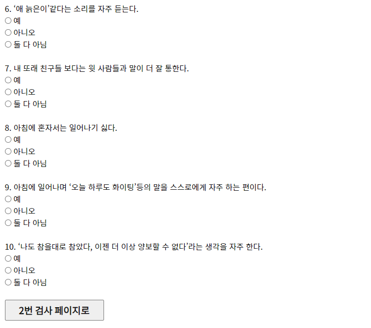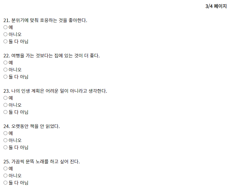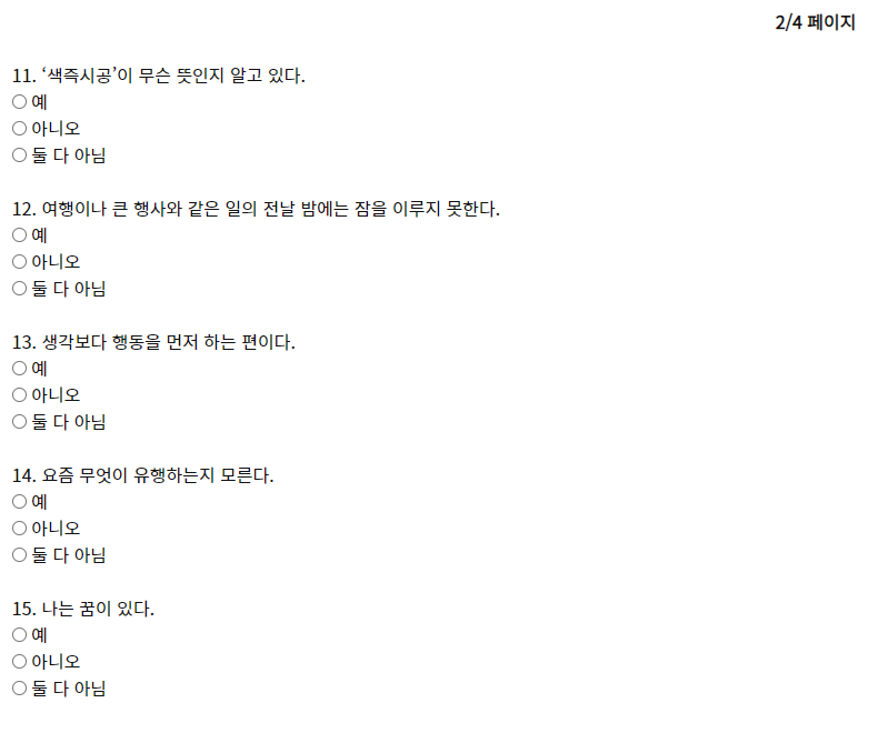 두 번 째 페이지 11번 부터 20번 까지 입력을 해주세요. 최대한 둘 다 아님을 선택하지 않아야 제대로된 결과를 받을 수가 있겠지요?