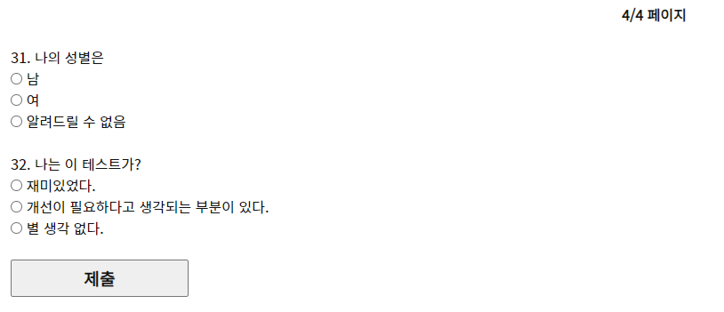 마지막 페이지는 2문제만 남아있습니다. 다 고르시고 제출을 눌러줍니다.