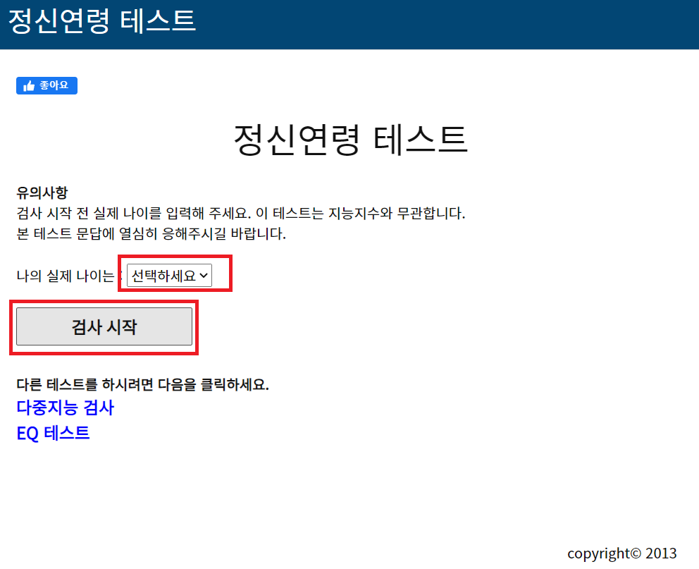 각설하고 먼저 링크를 알려드리겠습니다. 해당 링크로 접속을 하면 바로 정신연령 테스트를 시작할 수가 있는데, 로그인은 하실 필요가 없습니다. 단지 안내해드리는 것처럼 본인의 나이와 검사시작을 눌러주시면 됩니다.