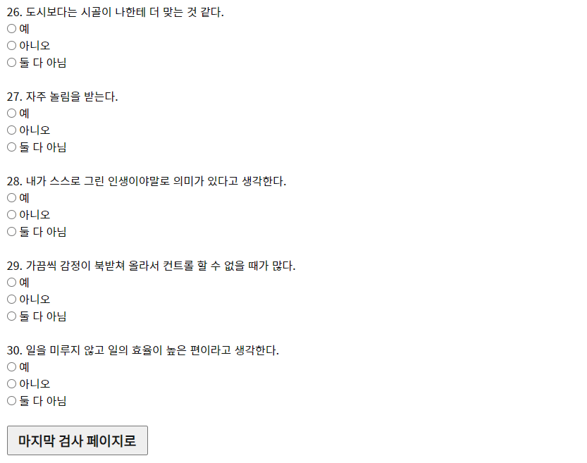 두 번 째 페이지 11번 부터 20번 까지 입력을 해주세요. 최대한 둘 다 아님을 선택하지 않아야 제대로된 결과를 받을 수가 있겠지요?