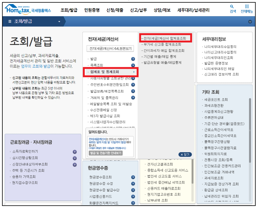 로그인을 해주신 뒤 상단메뉴에서 조회/발급을 눌러주면 전자세금계산서 메뉴가 뜨게 됩니다. 하위 메뉴중 합계표 및 통계조회 그리고 전자(세금)계산서 합계표 조회를 차례로 눌러주시면 됩니다.