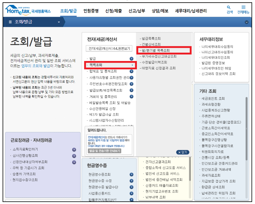 월/분기별 전자세금계산서 목록 조회 방법