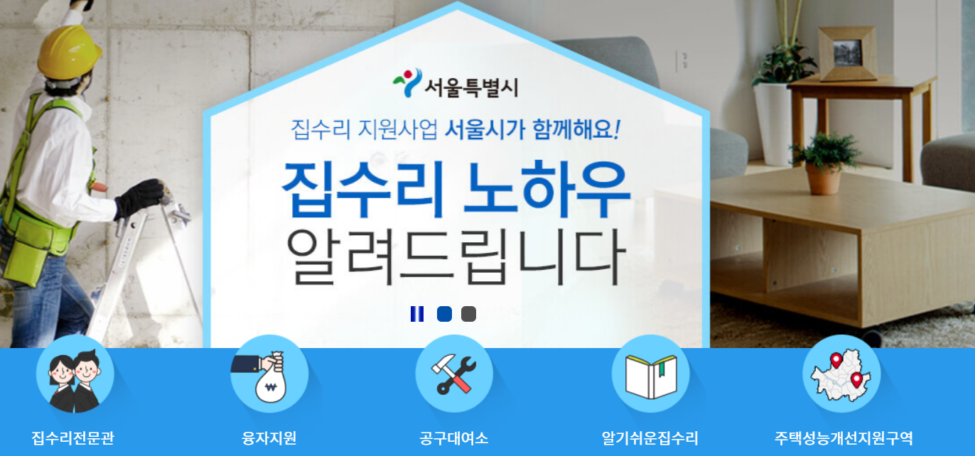 지원하는 것은 집을 수리하는데 들어가는 집수리비용의 보조금과 저리 융자를 지원해주게 됩니다. 수리비를 지원 받을 수 있는 대상을 확인하려면 공식홈페이지인 서울특별시 집수리닷컴으로 바로 들어가주시면 되겠습니다.