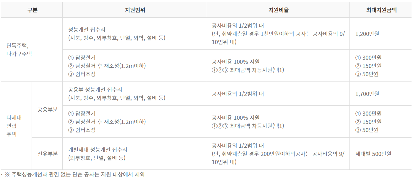 대상 주택은 단독가구, 다가구, 단독세대 그리고 연립주택에만 한해서 지원을 할 수가 있고 사용이 승인이 된 지 20년이 지난 주택들만 신청이 가능합니다.