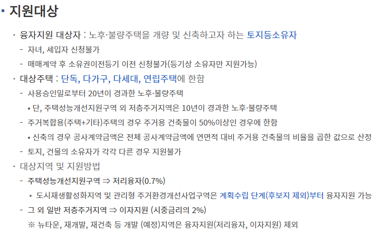 주택성능 개선지원구역은 저리융자 0.7%를 지원 받을 수가 있고, 그 외 되 재생활성화지역 및 관리형 주거환경개선사업구역이라면 계획단계부터에서도 미리 융자가 지원이 되게 됩니다.