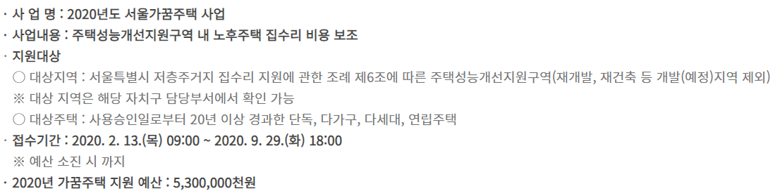 따라서 서울시에서는 이렇게 노후된 주택들을 철거가 아닌 수리하는 비용을 조금씩 지원해주고 있는데요. 그것이 바로 '서울시 가꿈주택사업'이라는 지원제도 입니다. 그렇다면 아래에서 더욱 자세한 내용을 알아볼까요.