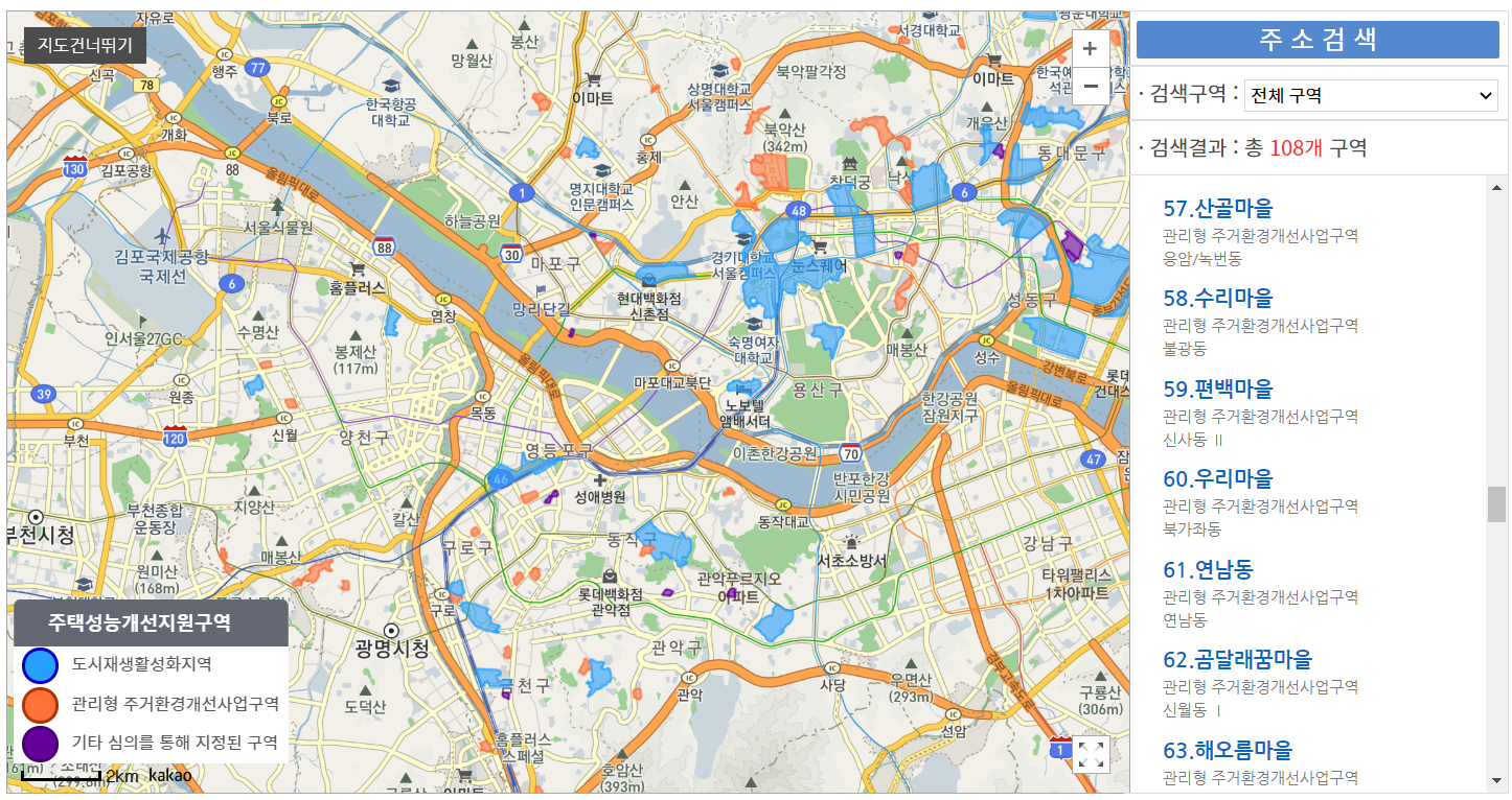모든 집이 노후 되었다고 우기면 끝도 없겠으니, 가꿈주택사업 지원하는 기준이 있게되는데요. 서울시가 지정한 '주택성능개선지원구역'으로 지정된 구역만 신청이 가능합니다. 주택성능 개선지원 구역 확인하기