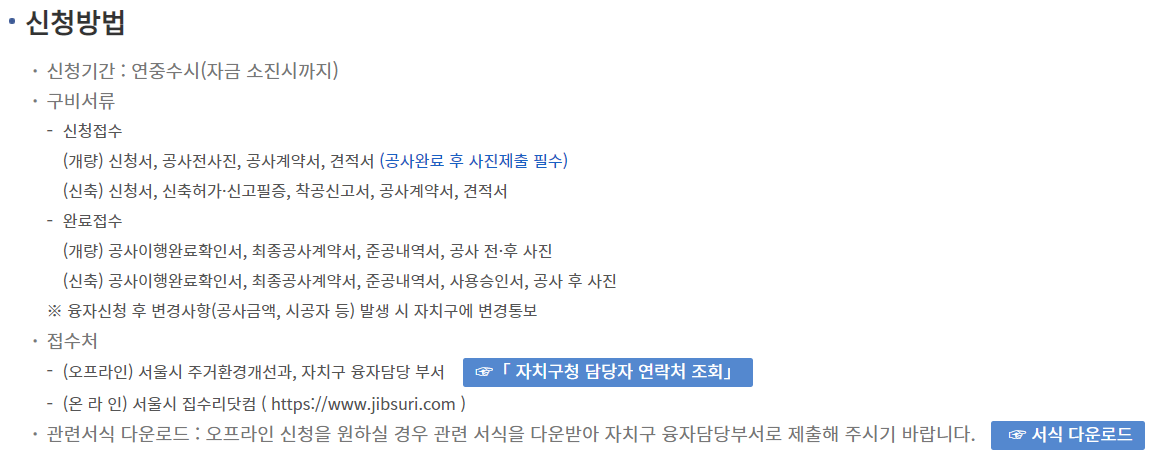 지원하는 것은 집을 수리하는데 들어가는 집수리비용의 보조금과 저리 융자를 지원해주게 됩니다. 수리비를 지원 받을 수 있는 대상을 확인하려면 공식홈페이지인 서울특별시 집수리닷컴으로 바로 들어가주시면 되겠습니다.