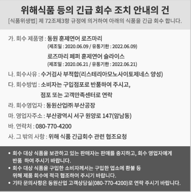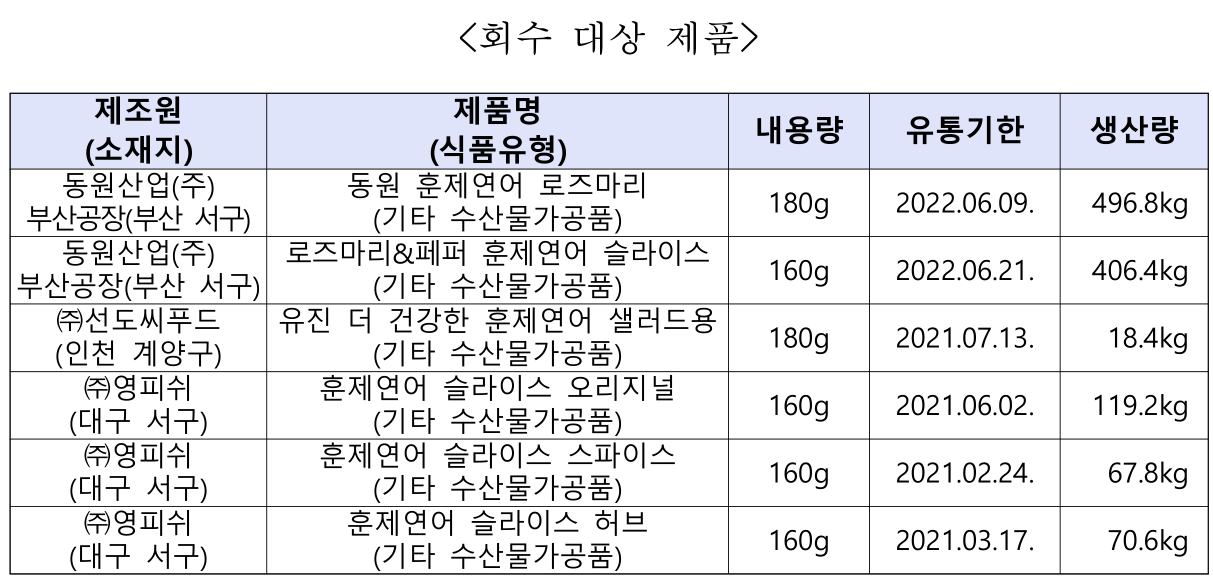대형마트에서 판매하는 혹은 유통 중인 훈제연어 중에서 11개 제품에 대해 식약처에서는 일부 6개 제품을 회수 조치를 시행하였습니다. 이유는 해당 제품들에게서 식중독균이 발견이 되었기 때문인데요.