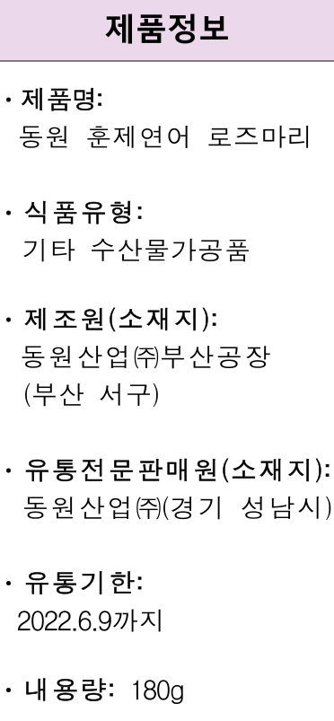 부산공장에서 제조하는 동원 훈제 로즈마리 외 5가지 품목리스트 입니다. 식품안전나라에서 더 자세한 내용이 확인가능합니다.