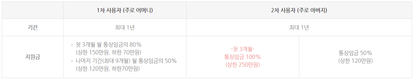 만약 엄마가 육아휴직을 사용한 뒤, 동일한 자녀에 대해서 아빠가 육아휴직을 이용할 경우 처음 3개월은 통상임금의 100%를 육아휴직 지원금을 지원 받게 됩니다. 하지만 200만원이 상한액이며, 아빠가 먼저 육아휴직을 사용해도 무방합니다.