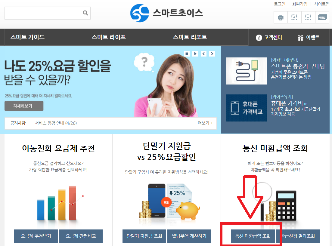 스마트초이스 사이트로 들어가 줍니다. 오른쪽 하단에 통신 미환급액 조회 링크가 바로가기 되어있기 때문에 사이트에 들어가면 한 눈에 들어옵니다.