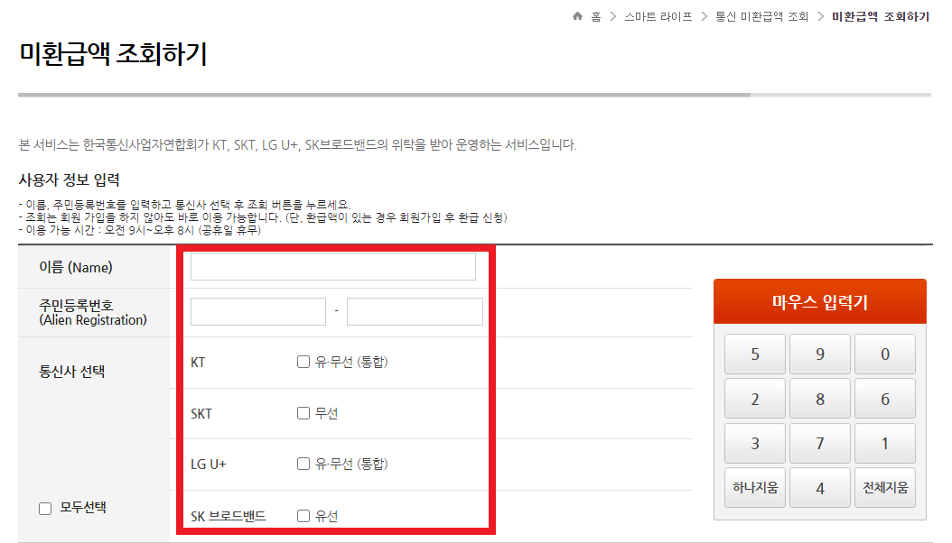 사용자 정보를 입력해 줍니다. 이름과 주민등록번호 그리고 통신사를 선택해 줍니다. 저는 모두 선택을 통해 모든 통신사에 미지급급이 없는지 확인해보려고 합니다.