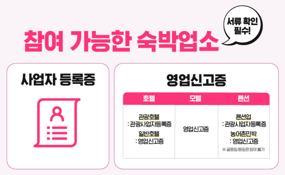 참여가능한 숙박업소는 다음과 같은 서류와 신고를 마친 숙박업소들만 가능하다는 점 꼭 확인하셔야합니다.