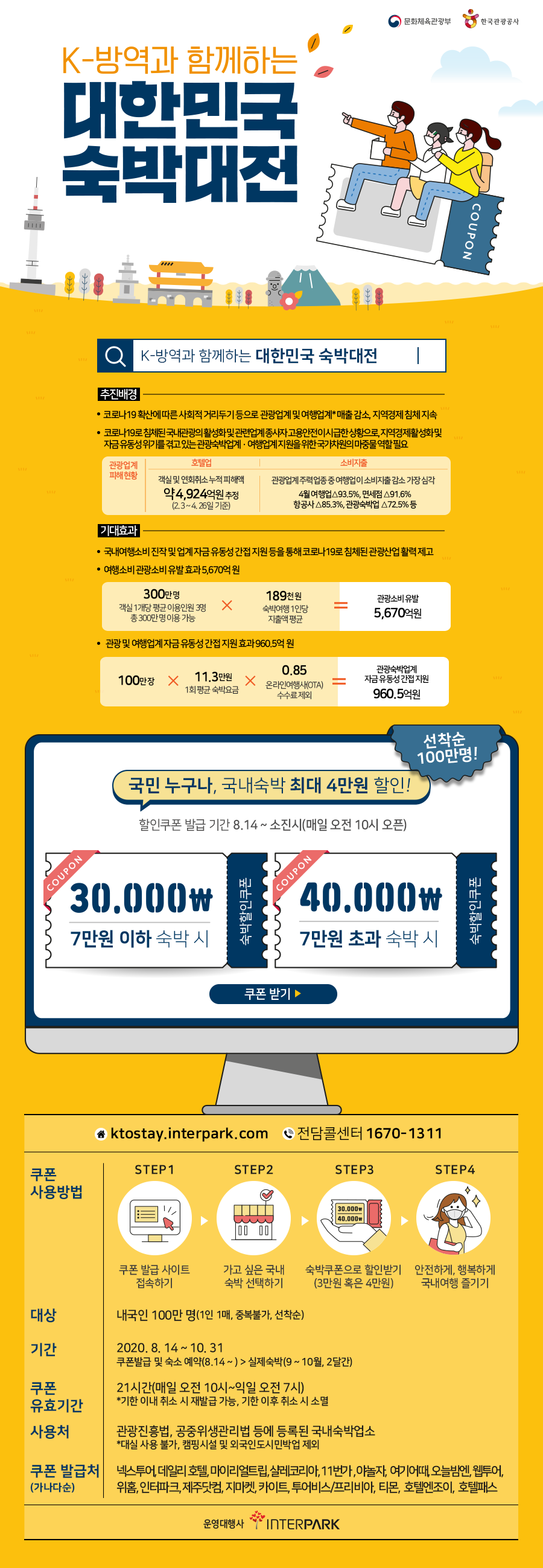 따라서, 숙박업소 사장님이시라면 9월과 10월에 손님을 다시 끌어모아 매출에 도움이 되도록 하는 것이 좋을 텐데요. 문화체육관광부와 한국관광공사 그리고 인터파크 등의 회사들이 협력하여 100만명에게 할인쿠폰을 나누어주는 '대한민국 숙박대전' 이벤트를 진행을 합니다.