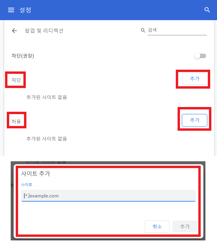 해당 옵션에서 바로 아래 보시면 차단과 허용을 개별적으로 추가를 할 수가 있게 됩니다.