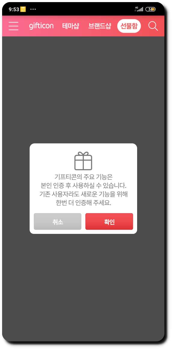 ▼ 다운로드 받아 주신 뒤 '선물함'으로 가봅시다. 기프티콘의 주요기능은 본인인증 후에 사용할 수 있다고 나오기 때문에 본인인증 절차를 거쳐 주시면 됩니다. 시럽 스마트월렛 회원이라면 간편 인증이 가능합니다.