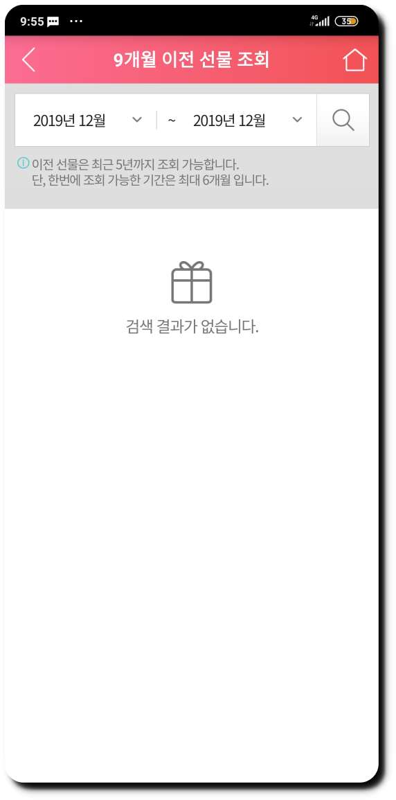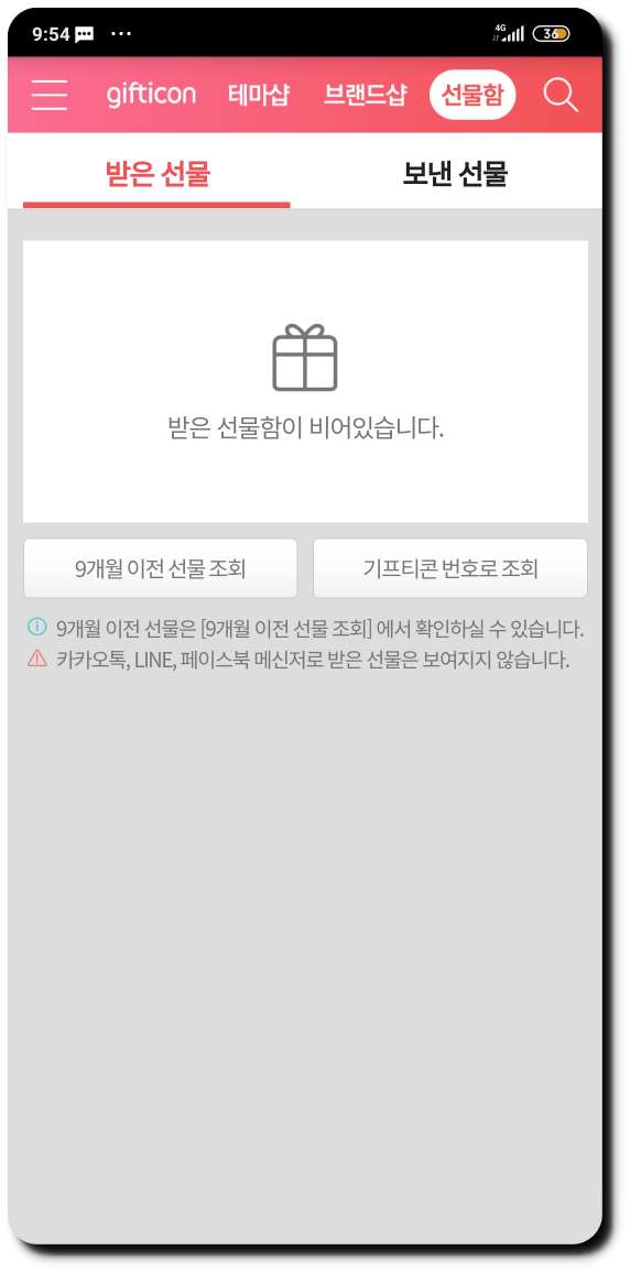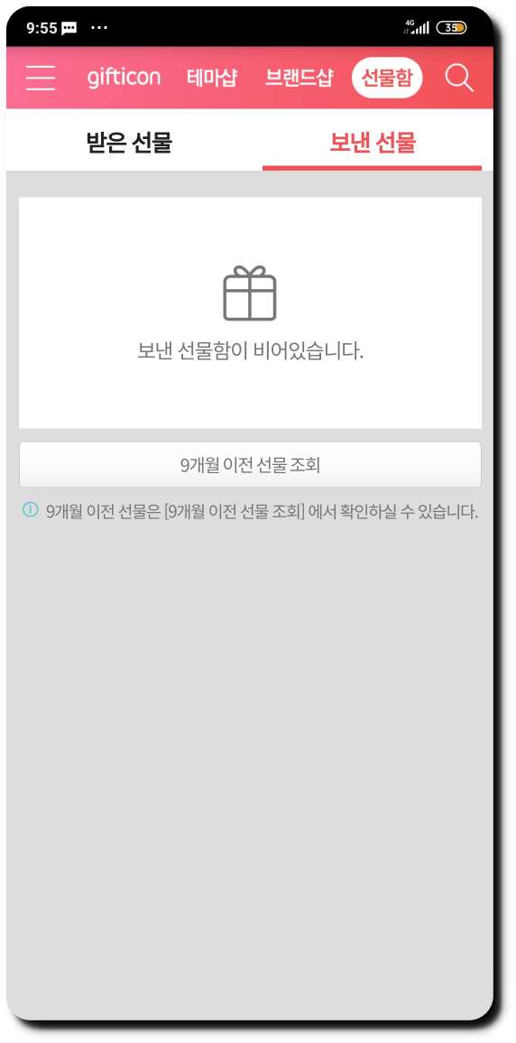 ▼ 만약 '받은 선물'이 아닌 '보낸 선물'을 조회하고 싶으면 '보낸선물'을 눌러 조회를 할 수가 있습니다. 최대 5년 이내의 보낸 선물이 조회가능하고 9개월이 넘어간 선물을 조회하고 싶다면 아래 '9개월 이전 선물 조회'를 눌러서 확인해 주시면 됩니다.