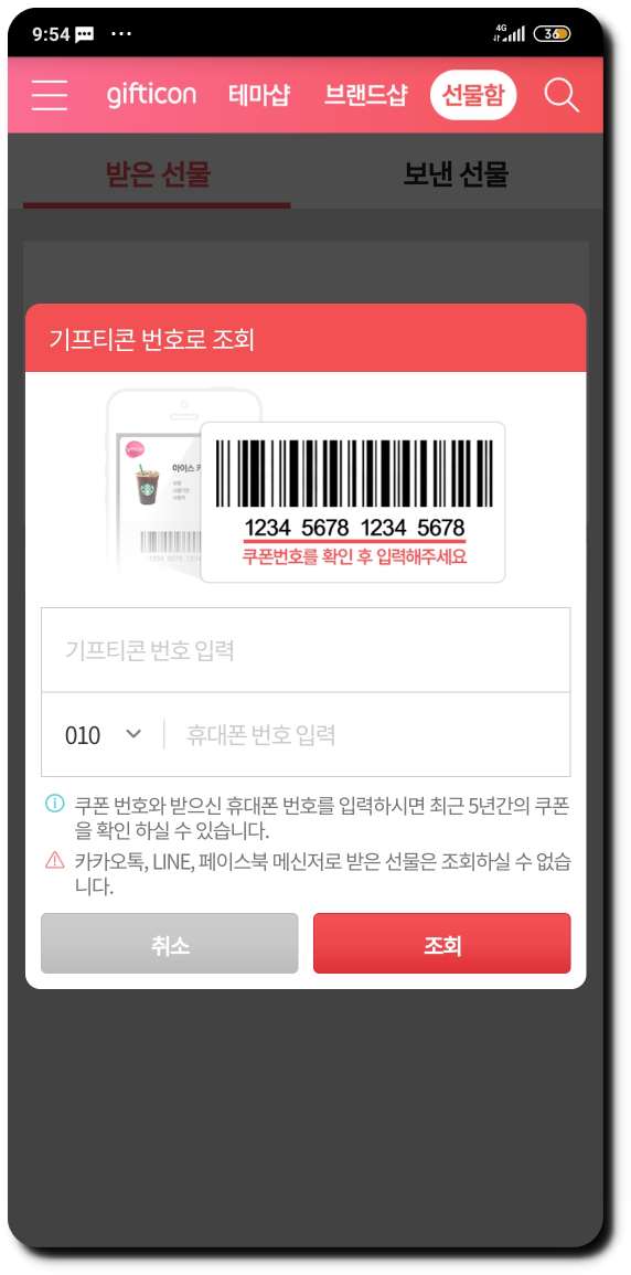 ▼ 인증이 완료되면 받은선물함에서 기프티콘 번호로 조회를 눌러 '쿠폰번호'와 '번화번호를 눌러 조회를 하면 기프티콘 사용여부를 확인할 수가 있습니다.