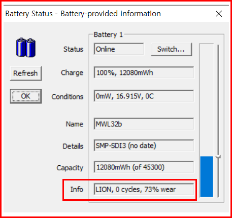 LION, 0 cycles, 73% wear 라고 써있는데 리튬 배터리를 사용하고 있고 73%의 손실율을 가진 배터리라고 설명하는 것입니다.