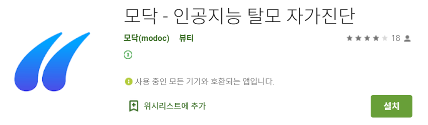모닥이라고 하는 앱입니다. 설문을 통해 본인이 탈모인지 아닌지 더욱 정확한 진단을 해볼 수가 있습니다. 탈모부위를 촬영해서 인공지능이 탈모진행도를 알려준다고합니다.