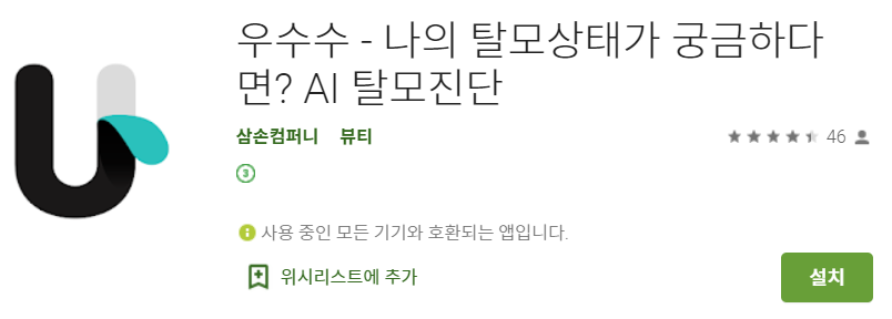 모든 어플은 구글플레이스토어나 애플의 앱스토어에 들어가면 다운로드받을 수있습니다. 혹은 이미지를 클릭해도 스토어로 바로갈 수 있습니다. 우선 가장 평점이 높은 어플입니다. 우수수라는 어플인데 나의 탈모상태가 궁금할 때 AI로 탈모를 진단해볼 수가 있습니다.