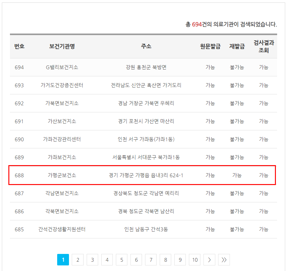 예를 들어 가평군 보건소에서는 재발급이 가능한 것을 확인할 수가 있습니다. 만약 재발급이 가능한지 살펴보기 위해서는 이렇게 미리 인터넷으로 재발급이 가능한지 확인하는 방법도 있지만 가장 좋은 방법은 검사를 받은 보건소에서 직접 발급 받는 것이 가장 좋습니다.