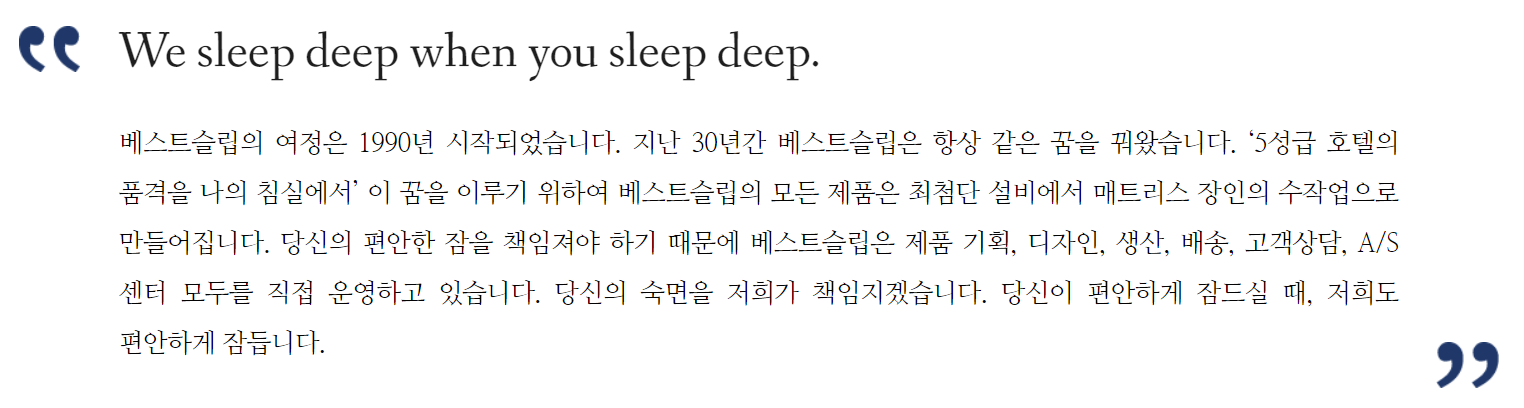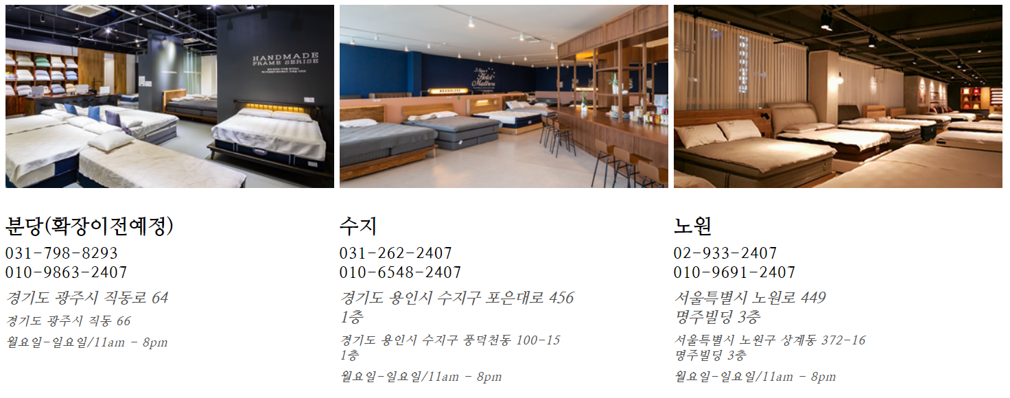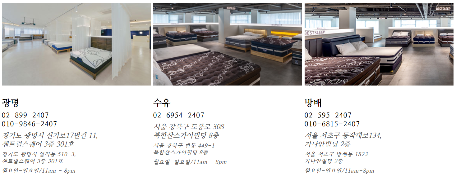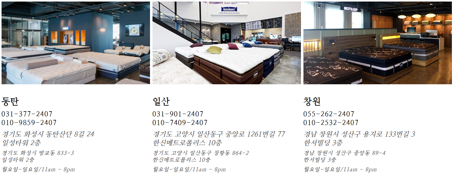 매트리스 제조공장은 경기도 광주에 위치해 있는데, 이 곳에서 최첨단 설비와 장인들의 수작업으로 제조가 된다고 하는 매트리스는 맞춤으로도 제조하고 있기 때문에 굉장히 유명합니다. 매트리스를 판매하는 곳은 공식 홈페이지인 bestsleep.us 에서 다양한 매트리스 상품들을 구매하실 수가 있습니다.