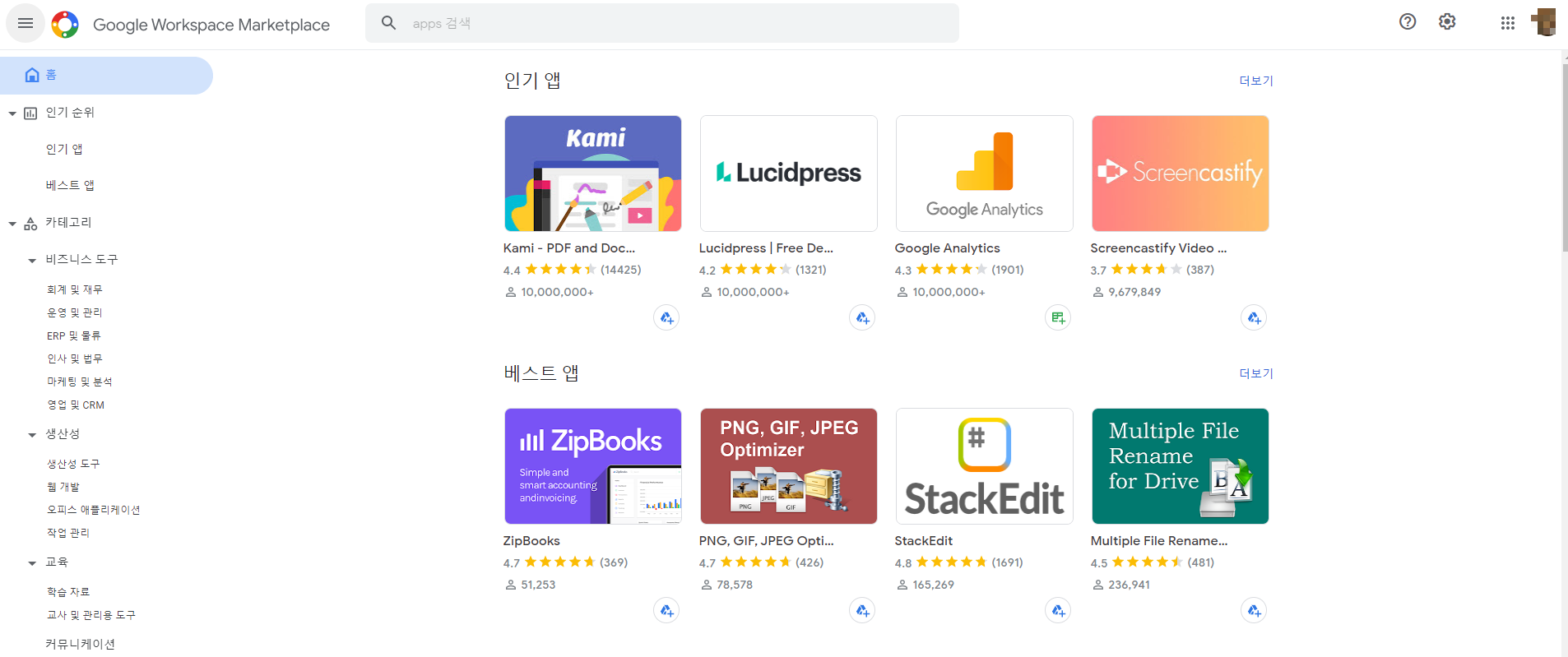 아래처럼 나오는데 우리가 잘 알고 있는 구글확장프로그램과 정말 비슷하게 생겼지만 뭔가 다르다. 왼쪽 메뉴에서보면 카테고리가 회계 및 재무, 운영 및 관리, ERP 및 물류, 인사 및 범무, 마케팅 및 분석, 영업 및 CRM 등이 있다. 더 아래를 보면 생산성 도구, 웹개발, 오피스 애플리케이션, 작업관리 그리고 교육에는 학습 자료와 교사 및 관리용 도구 등이 있는 것을 볼 수가 있는데, 그렇다. 보다시피 이건 사업자(?)용 구글앱스토어 같은 느낌이난다.
