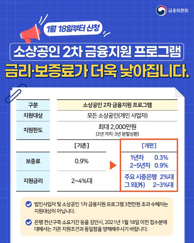 2021년 1월 18일 부터 최대 2%로 내린 소상공인 2차 금융지원 프로그램 그리고 최대 1000만원 의 추가대출을 받을 수 있는 특별지원 프로그램이 진행됩니다! 바로 신청해봅시다.