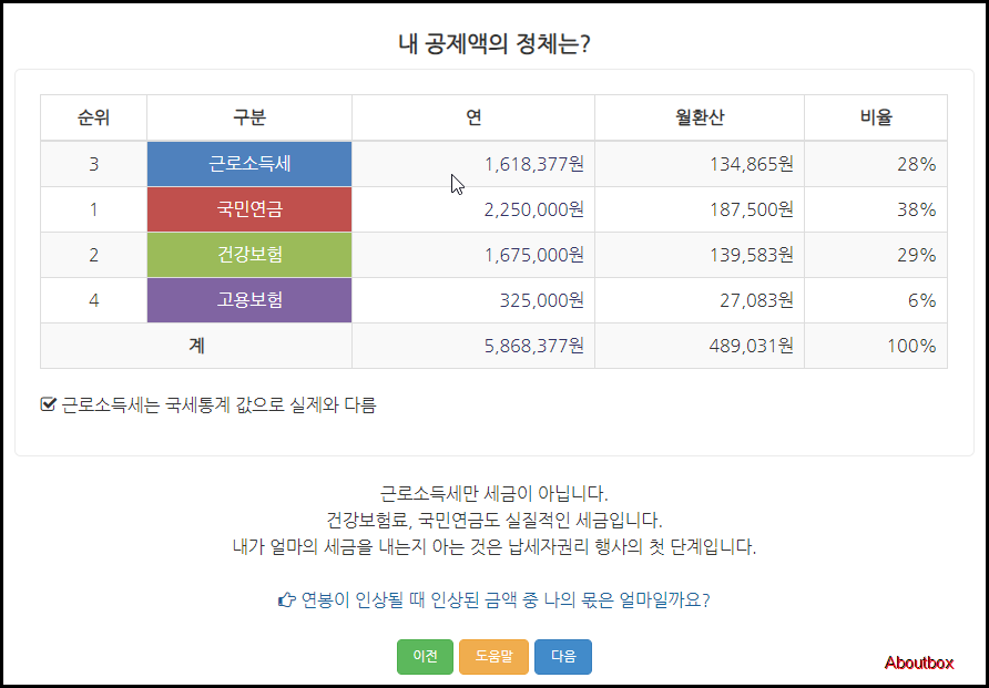 다음을 눌러주시면 실제로 내는 세금과 실수령액을 확인하실 수가 있습니다. 다시 다음을 눌러 다음 화면을 확인해봅시다.
