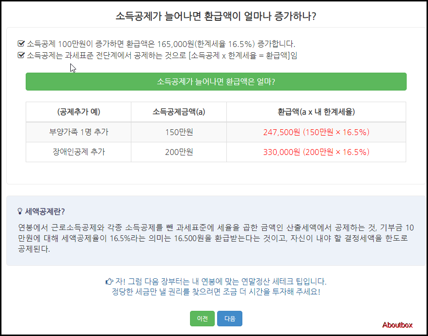 소득공제와 환급액의 증가관련 계산을 확인해 볼 수 있습니다.