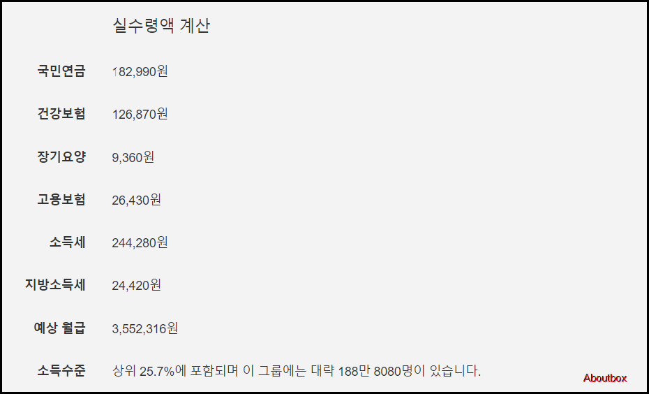 아래처럼 국민연금, 건강보험, 장기요양, 고용보험, 소득시, 지방소득세 그리고 예상이 되는 세후월급과 대한민국 소득수준 상위 몇 퍼센트인지 확인을 할 수가 있습니다.