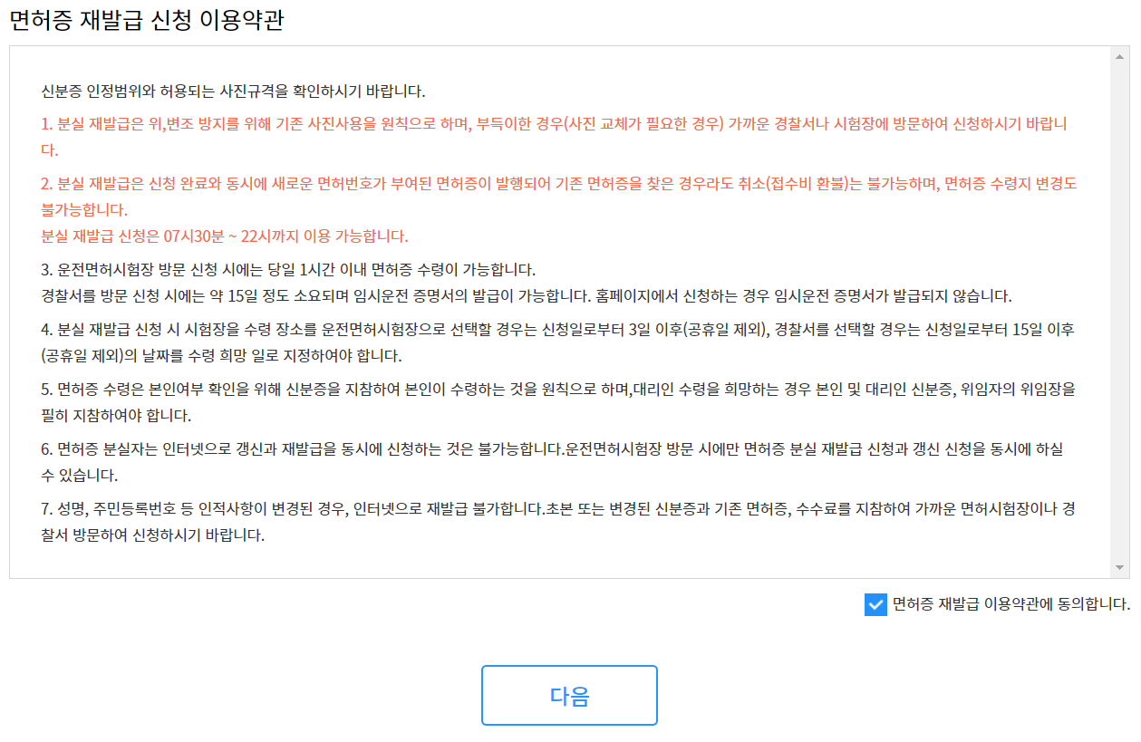 1. 약관에 동의를 해줍니다. 면허증 재발급 신청 이용약관입니다.