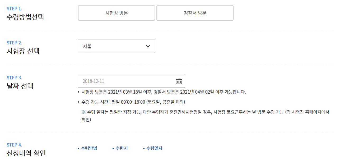 3. 운전면허증을 재발급받을 수령지와 날짜를 선택합니다. 연락처를 등록해줍니다.