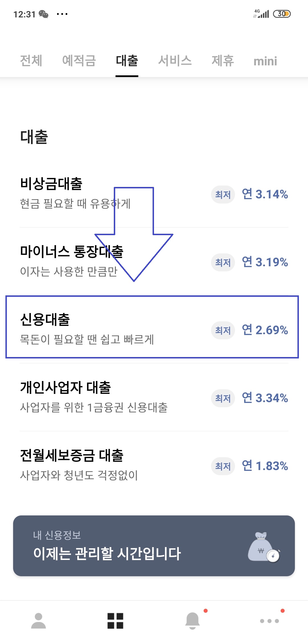 3. 대출 서비스에서 신용대출 혹은 개인사업자 신용대출 클릭