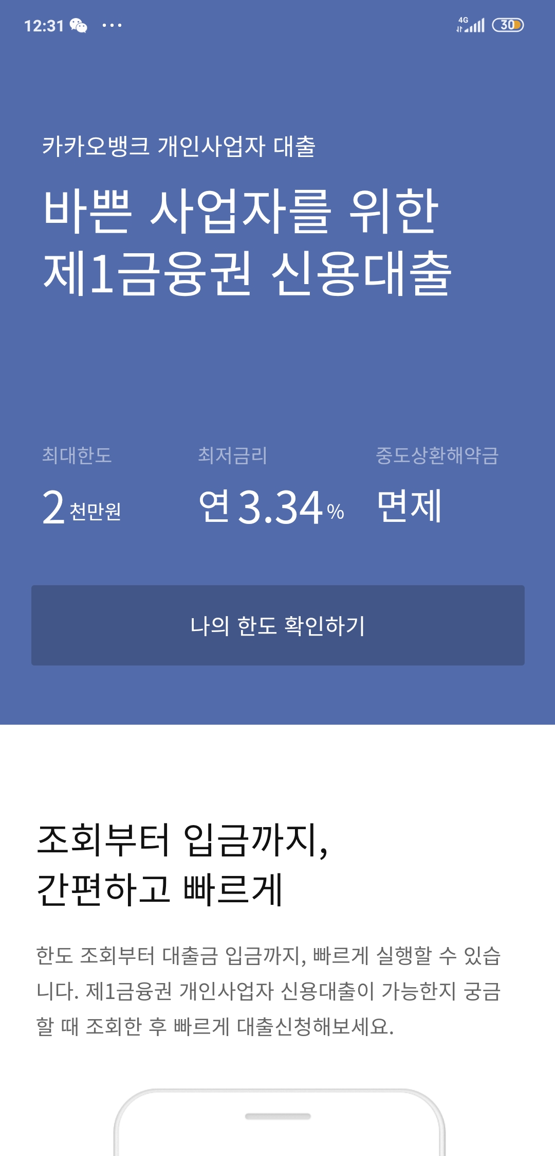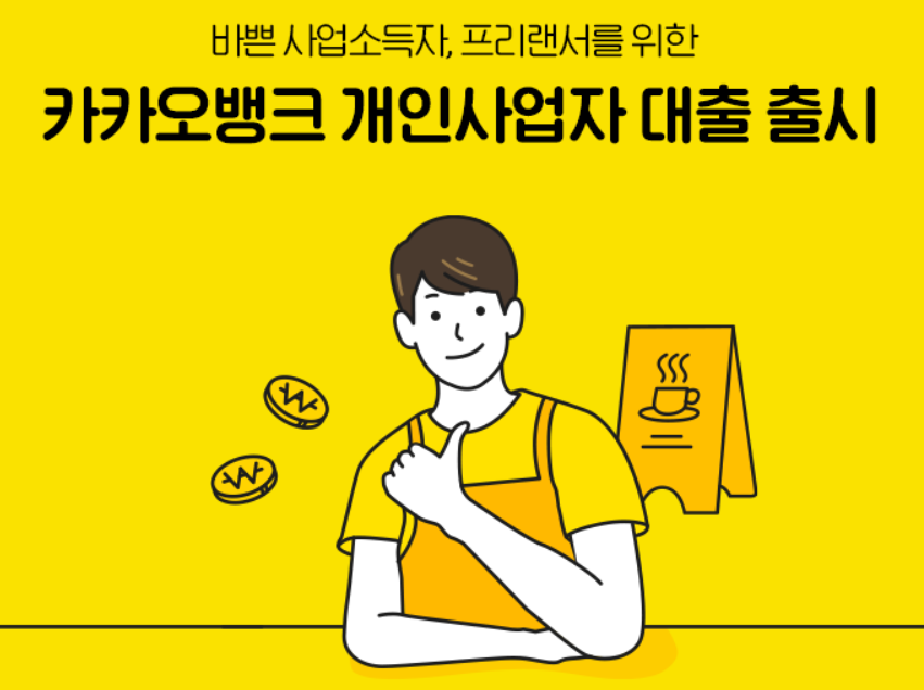 카카오배으에서는 개인사업자들을 대상으로 최대한도 2,000만원 그리고 소득이 있는 개인사업자에게 대출을 해주고있습니다. 1금융권 신용대출상품입니다.