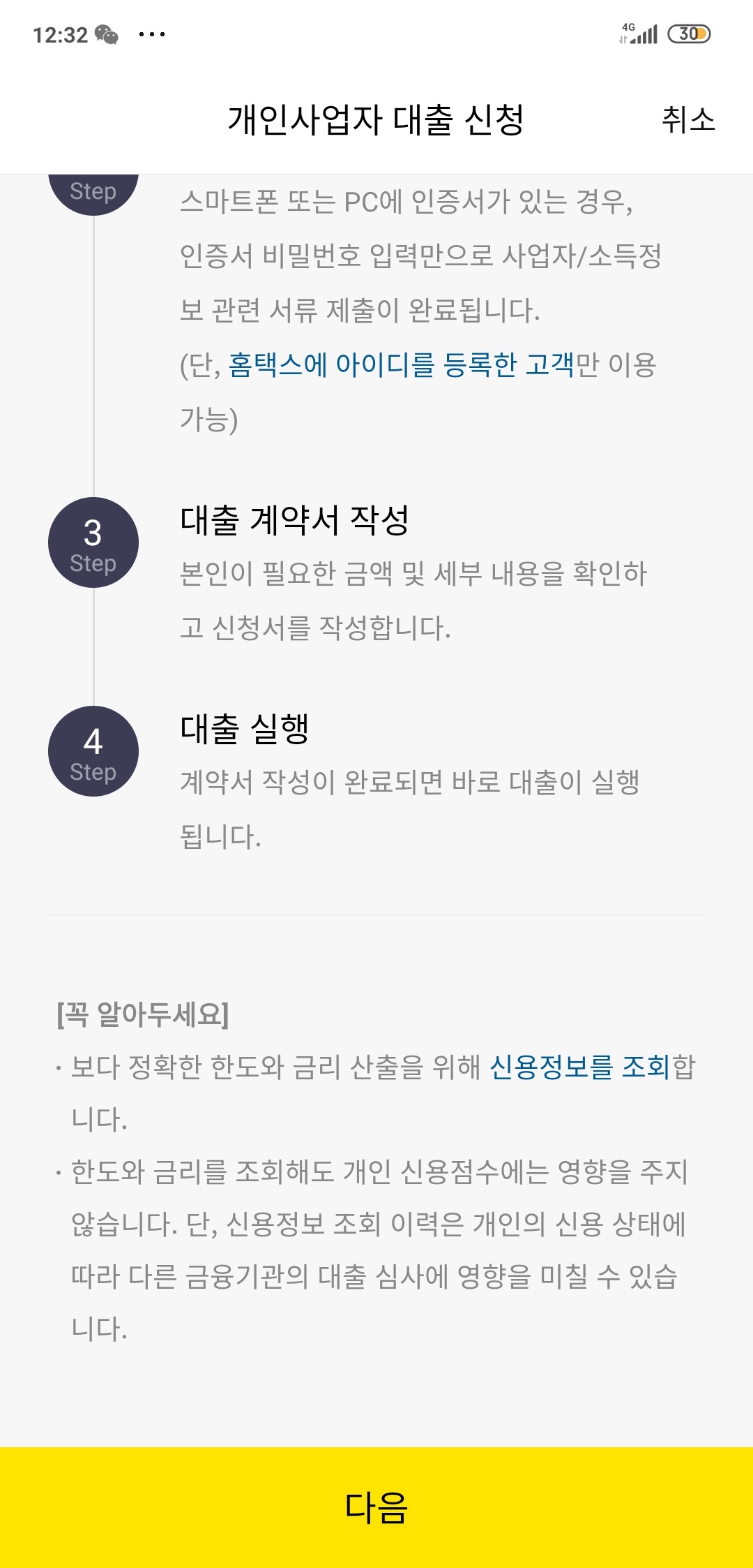 3. 대출 서비스에서 신용대출 혹은 개인사업자 신용대출 클릭