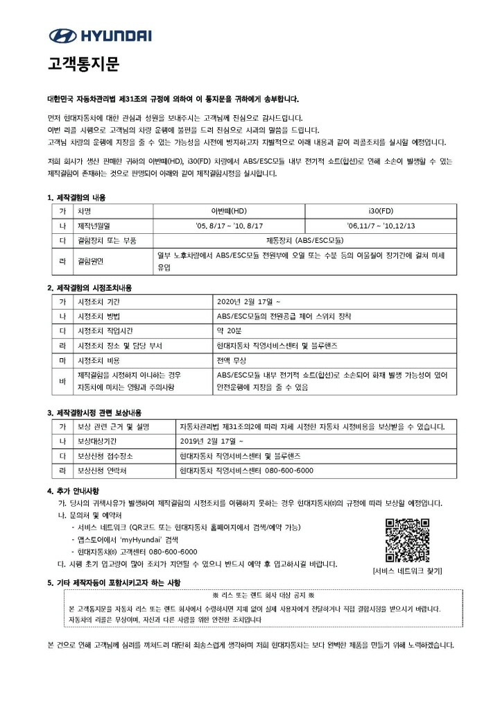 ▶ 귀하의 자동차는 제동장치(ABS/ESC모듈)와 관련된 결함으로 인해 일부 노후 추량에서 ABS/ESC모듈 전원부에 오일 또는 수분 등의 이물질이 장기간에 걸쳐 미세하게 유입되어 ABS/ESC모듈 내부 전기적 쇼트(합선)로 소손되어 화재가 발생 할 수 있는 가능성이 확인되어 이를 시정하고자 현대자동차에서 리콜을 실시합니다.